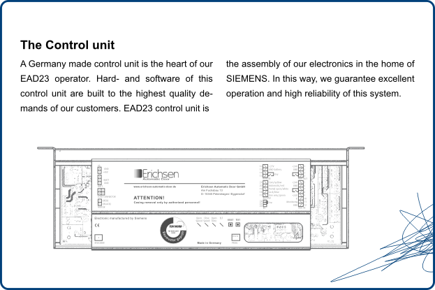 Our EAD23 operator is characterized by the perfect combination of sophisticated, mechanical and electrical components. The examination of the operator was carried out at the TÜV Nord. EAD23 sliding door represents highest quality on the international market.