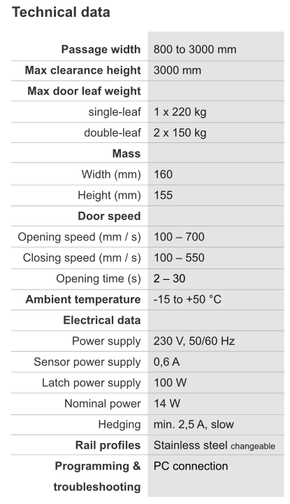 With uniform operation, long service life and minimal maintenance, the EAD24 operator has proved is reliability and longevity in Office buildings, hospitals, restaurants, hotels, etc. This system is manufactured in accordance with the relevant standards, is fully compliant with the German standards and complies with DIN 18650.