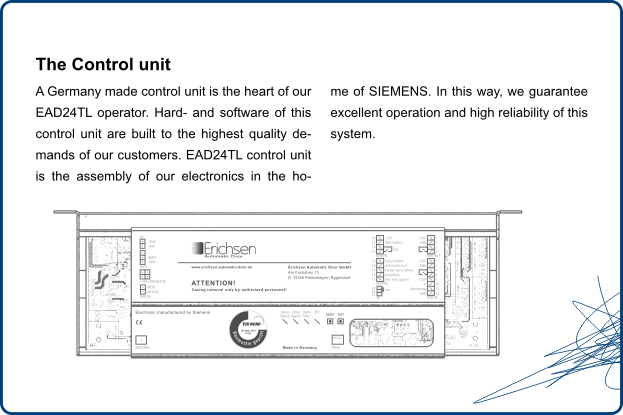 Thanks to the EAD24TL operator, you are able to achieve an extended input range despite the overall width limitation drive. Maximize your input with an elegant design. This model with its very quiet movement and its long-lasting and powerful DC motors is ideal for your application.