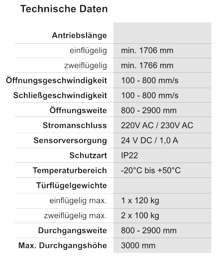 Dieser Schiebetürantrieb lässt sich schnell & einfach installieren. Die Funktionalität & das Zubehör kann an Ihre Bedürfnisse angepasst werden. Die Programmierung erfolgt direkt am Steuergerät, daher ist es nicht notwendig in  weitere Geräte zu investieren.